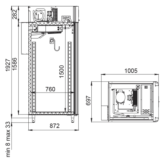 Каталог оборудования Холодильное оборудованиеШкафы холодильныеСпециализированные холодильные шкафыШкаф холодильный для вызревания сыра Polair CS107 Cheese полки окраш. Шкаф холодильный для вызревания сыра Polair CS107 Cheese полки окраш. Код товара: 062-635 Поделиться: WhatsAppTelegram СравнитьДобавить в КПВ избранное 0 385 475 ₽ В корзину 0 шт Под заказСамовывоз сегодня бесплатно Взять в кредит Купить в лизинг Получить консультацию в WhatsApp Описание Характеристики Отзывы 0 Инструкции 5 Шкаф холодильный для вызревания сыра Polair CS107 Cheese полки окраш. предназначен для создания оптимальных условий хранения и дозревания твердых и полутвердых сыров на предприятиях общественного питания и торговли. Монолитный цельнозаливной корпус изготовлен из нержавеющей стали снаружи и изнутри (за исключением задней стенки), что гарантирует высокую прочность и долговечность оборудования. Шкаф рассчитан на работу при температуре окружающей среды до 40 °С. Особенности: Верхнее расположение агрегата Многофункциональная русифицированная контрольная панель с 5-дюймовым дисплеем Возможность создания и сохранения собственных программ в памяти электронного блока Четыре сетчатые полки из окрашенной стали Встроенный ультразвуковой увлажнитель (требуется подключение к системе очищенной воды и централизованной канализации) Распашная дверь с заливной теплоизоляцией Заменяемый уплотнитель двери с магнитной вставкой Встроенная ручка для удобного открытия Отключаемая внутренняя LED-подсветка Штампованное углубление в дне корпуса для удобства ухода и очистки Надежный замок Педаль для бесконтактного открывания двери Регулировка уровня влажности от 60% до 95% Максимальная нагрузка на каждую полку — 40 кг Толщина стенки корпуса — 43 мм Polair CS107 Cheese полки окраш. — это надежное и функциональное оборудование для хранения и дозревания сыров, обеспечивающее точный контроль температуры и влажности. Прочный корпус и современный набор функций делают этот шкаф идеальным выбором для предприятий общественного питания и торговли, стремящихся поддерживать качество сырной продукции на высоком уровне.Изображение товара, представленного на фото, может отличаться от его фактического вида. Показать все Габаритные размеры697×1005×1960 ммДиапазон рабочей температурыот -2 до +30 °CДлина697 ммШирина1005 ммВысота1960 ммОбъём700 лКол-во дверей1 Тип двериМеталлическая Количество полок4 штДопустимая нагрузка на полку40 кгУровень влажностиот 60 до 95 %Холодильный агрегатВстроенный Тип оттайкиАвтоматическая Тип охлажденияДинамическое ПодсветкаЕсть ХладагентR290 Вес нетто144 кгВес брутто171 кгБрендPolairВсе специализированные холодильные шкафы Из нержавейки Оставить отзыв Еще никто не оставил отзыв на этот товар Схема POLAIR CS107 Cheese.jpgИнструкция на POLAIR CS107 Cheese.pdfБрошюра на POLAIR CS107 Cheese.pdfДекларация о соответствии.pdfСертификат соответствия.pdf Похожие товары Перейти в каталог В наличии 186 231 ₽ Шкаф холодильный HURAKAN HKN-MA230 для созревания мяса Под заказ 405 450 ₽ Шкаф холодильный для хлебопекарных производств Polair CS107 Bakery Br черный, со стеклом (Тип 1) Под заказ 282 471 ₽ Шкаф холодильный для вызревания мяса и сыра Carboma M700GN-1-G-MHC 0430 В наличии 397 290 ₽ Шкаф холодильный для хлебопекарных производств Polair CS107 Bakery Br (Тип 1) Под заказ 391 000 ₽ Шкаф холодильный для вызревания мяса Polair CS107 Meat (Тип 2) Под заказ 118 831 ₽ Шкаф холодильный HURAKAN HKN-MA100 для созревани