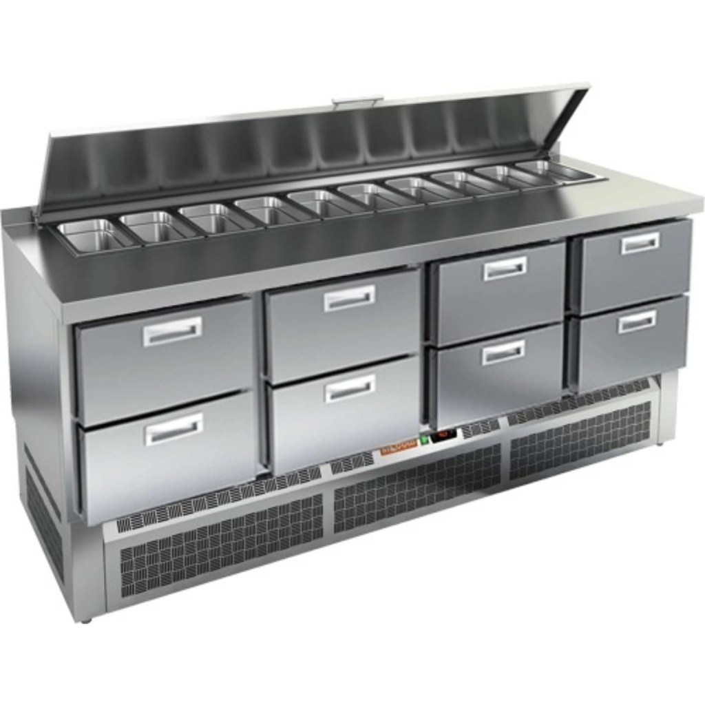 Модель сочетает в себе прочную рабочую поверхность и охлаждаемый внутренний объем, что упрощает процесс приготовления: все необходимые ингредиенты всегда под рукой. Корпус и столешница изготовлены из нержавеющей стали, устойчивой к воздействию влаги, механическим повреждениям и легко поддающейся очистке. Металлическая крышка защищает продукты от загрязнений и сохраняет их свежесть.