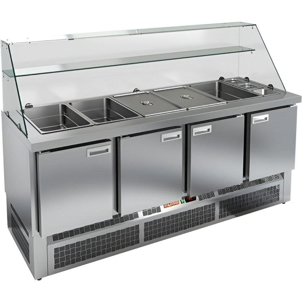 Модель обеспечивает удобный доступ к продуктам и позволяет повару работать максимально эффективно. Корпус и столешница изготовлены из нержавеющей стали, что гарантирует долговечность конструкции, устойчивость к коррозии и соответствие санитарным нормам. Дополнительным преимуществом является высокое защитное стекло, которое обеспечивает гигиеничность выкладки и удобство при обслуживании гостей.