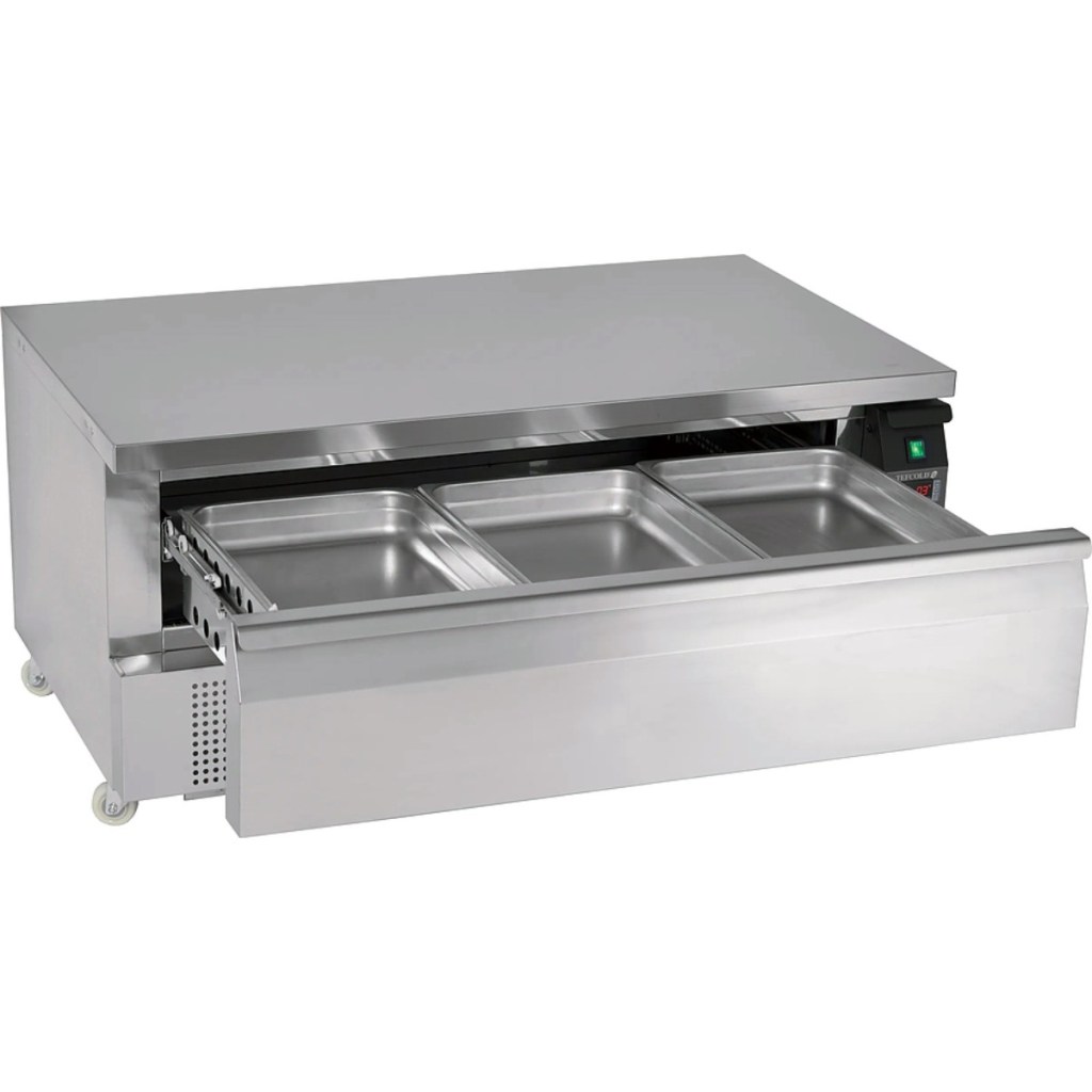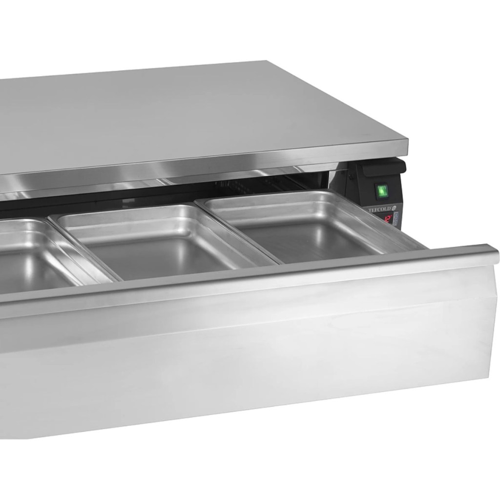 Каталог оборудования Холодильное оборудованиеСтолы охлаждаемыеСтолы холодильные комбинированныеСтол холодильно-морозильный TEFCOLD UD1-3 Стол холодильно-морозильный TEFCOLD UD1-3 Код товара: 010-375 Поделиться: WhatsAppTelegram СравнитьДобавить в КПВ избранное 0 158 753 ₽ В корзину 0 шт В наличииСамовывоз сегодня бесплатно Взять в кредит Купить в лизинг Получить консультацию в WhatsApp Описание Характеристики Отзывы 0 Инструкции 2 Стол холодильно-морозильный TEFCOLD UD1-3 предназначен для обработки ингредиентов и хранения охлаждённых и замороженных продуктов на предприятиях общественного питания и торговли. Модель оснащена расположенным снизу агрегатным отсеком, столешницей, гастрономированным выдвижным ящиком и кнопочной панелью управления с цифровым дисплеем. Корпус и внутренняя отделка выполнены из высококачественной нержавеющей стали SS304, обеспечивая долговечность и лёгкость в уходе. Особенности модели: Динамическое охлаждение с равномерной циркуляцией воздуха Автоматическая оттайка для удобства эксплуатации Электронный контроллер Dixell с цифровой температурной индикацией Возможность переключения между холодильным (1–4 °C) и морозильным (-21–-18 °C) режимами Самодиагностика с отображением неисправностей 4 поворотных колеса (2 с фиксацией) для лёгкой транспортировки Экологичный энергоэффективный хладагент R290, масса 0,07 кг Прочные износостойкие материалы и качественные комплектующие Класс энергоэффективности: E Климатический класс: 5 Формат гастроёмкостей: GN3/1, вместимость 3 шт. Общий объём: 116 л, полезный объём: 77 л Среднее энергопотребление: 6,05 кВт/сутки, 2208 кВт⋅ч/год Максимальная нагрузка: столешница 240 кг, ящик 60 кг Максимальная температура окружающей среды: 40 °C, относительная влажность до 40% Внутренние размеры: 1000×565×205 мм Уровень шума: 54 дБ TEFCOLD UD1-3 — универсальный и надёжный комбинированный стол для профессиональных кухонь. Он обеспечивает эффективное охлаждение и заморозку продуктов, удобство эксплуатации и долговечность благодаря прочным материалам и качественной сборке. Эргономичный дизайн и высокая энергоэффективность делают его оптимальным решением для предприятий общественного питания и торговли.Изображение товара, представленного на фото, может отличаться от его фактического вида. Показать все Габаритные размеры1230×700×600 ммТемпература морозильного отделенияот -21 до -18 °CТемпература холодильного отделенияот +1 до +4 °CРасположение агрегатаНижнее Материал столешницыНержавеющая Тип столаС ящиками Полезный объем77 лКоличество ящиков1 штТип гастроемкостейGN3/1 Климатический класс5 Уровень шума42 дБНапряжение230 ВМощность0,27 кВтРасход электроэнергии в сутки2,39 кВт/сутТип охлажденияДинамический Тип оттайкиАвтоматическая ХладагентR290 Габариты в упаковке1310×770×740 ммВес нетто90 кгВес брутто105 кгБрендTefcold Оставить отзыв Еще никто не оставил отзыв на этот товар Инструкция на TEFCOLD UD1-3.pdfСпецификация на TEFCOLD UD1-3.pdf Похожие товары Перейти в каталог Под заказ 111 051 ₽ Стол холодильный среднетемпературный HiCold GNG 1 BR2 HT Под заказ 79 911 ₽ Стол холодильный среднетемпературный HiCold GN 1/TN W Под заказ 79 461 ₽ Стол холодильный среднетемпературный HiCold SN 1/TN W Под заказ 104 947 ₽ Стол холодильный среднетемпературный Abat СХС-70 с бортом (дверь) С этим товаром покупают Под заказ 99 931 ₽ Шкаф холодильный Abat ШХс-0,5-02 Ранее просмотрено Под заказ 797 753 ₽ Бункер для льда Scotsman UBH 