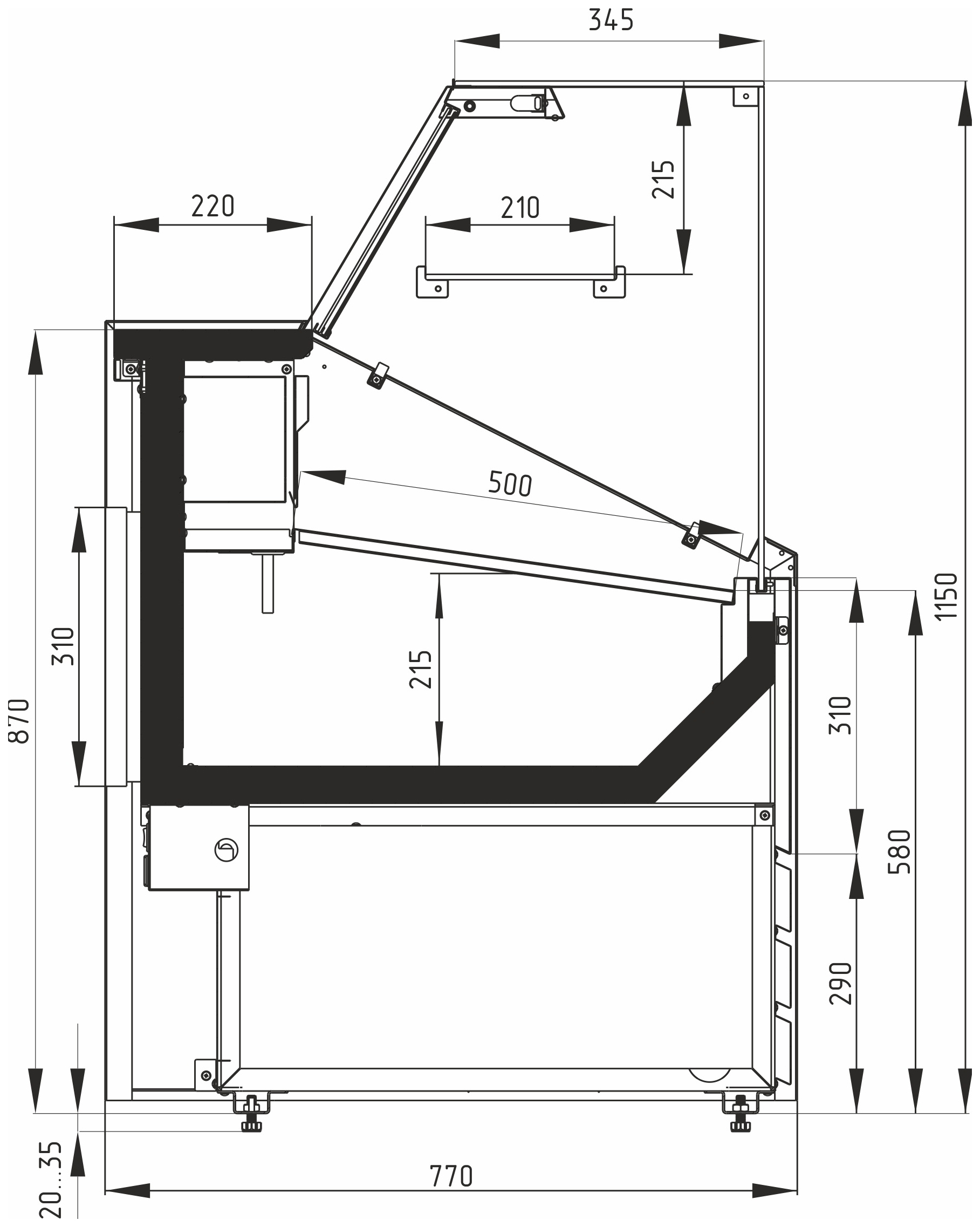 Конструкция витрины включает накопитель для продуктов, поддон для выкладки и регулируемые ножки высотой 20–35 мм. Столешница, зона выкладки, боковые и нижняя фронтальная панели, а также обшивка светильника и испарителя выполнены из стали серебристого цвета.Декоративная передняя панель — из стали, держатель стекла — из нержавеющей стали. Боковины и столешница имеют пенополиуретановую теплоизоляцию.