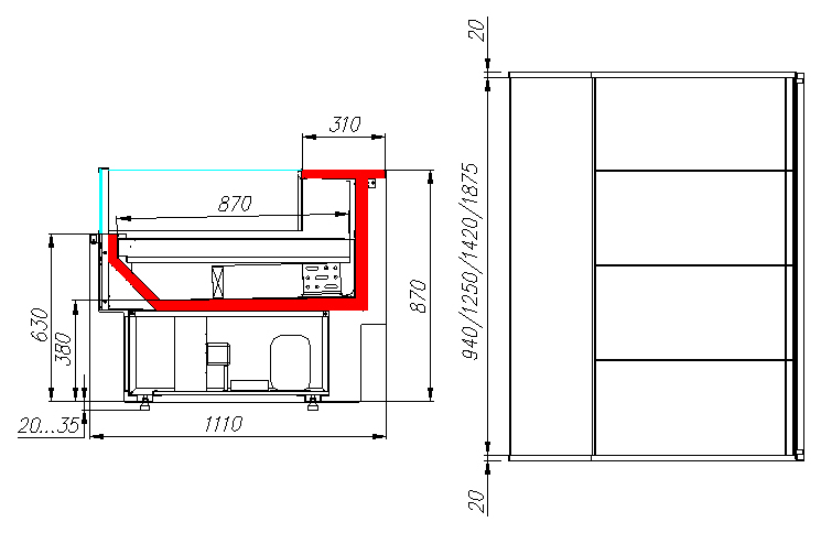 Конструкция оснащена регулируемыми ножками (20–35 мм), что позволяет удобно выравнивать витрину на месте установки. Поверхность выкладки и столешница выполнены из шлифованной нержавеющей стали, обеспечивающей долговечность и простоту ухода.